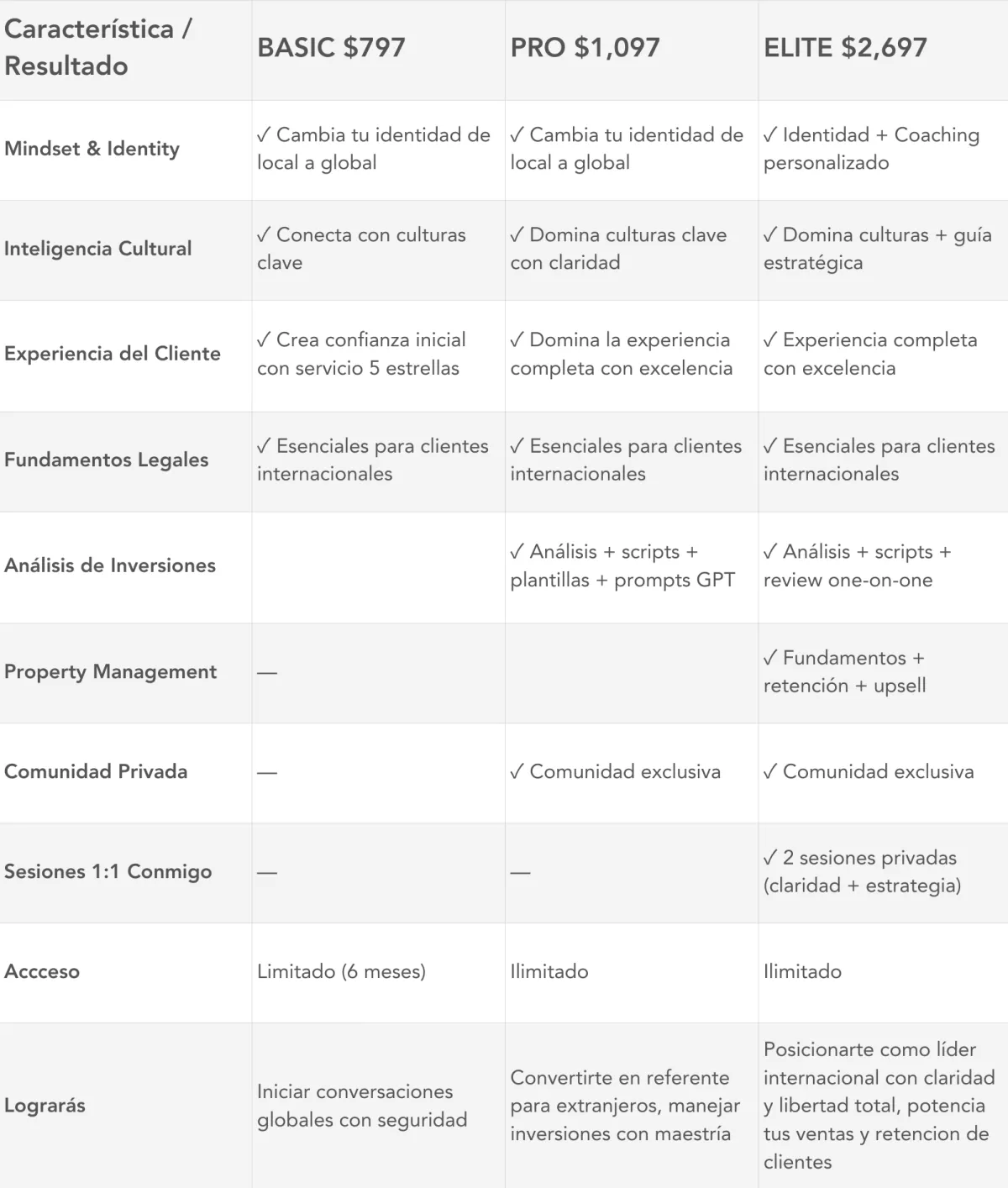 Cada nivel está diseñado para llevarte más lejos en tu carrera internacional. Revisa qué incluye cada uno y elige el que mejor se adapte a tus objetivos.